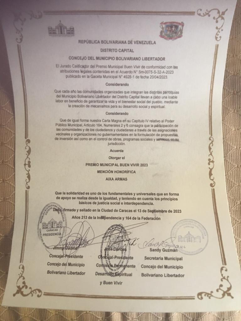 La Comisión Permanente de Desarrollo Espiritual y Buen Vivir del Concejo Municipal del Municipo Bolivariano Libertador otorgó el Premio Municipal Buen Vivir 2023, mención honorífica a Aixa Armas, presidenta de la asociación civil Mujer y Ciudadanía, por sus méritos en el trabajo de formación de las mujeres y construcción de una ciudadanía responsable.
