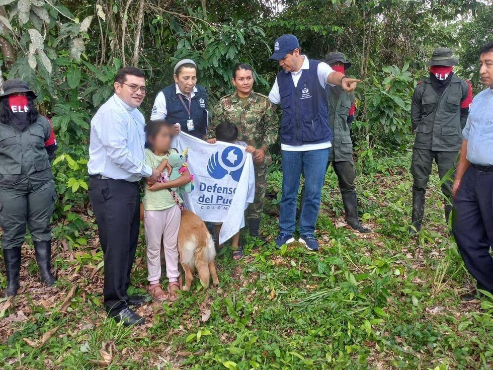 El Ejército de Liberación Nacional (ELN) ha liberado en la tarde de este viernes a la sargenta que había secuestrado el lunes y a sus dos hijos, según han confirmado las Fuerzas Militares y el Ministerio de Defensa. Las fotos difundidas muestran a la madre uniformada, a los dos niños —de seis y ocho años— y a la perra de la familia. En una de las imágenes, la niña lleva en brazos a su unicornio de peluche, mientras que su hermano se esconde detrás de una bandera de la Defensoría del Pueblo. Los tres están rodeados de hombres y mujeres vestidos que visten uniformes grises y que llevan los rostros cubiertos por pañoletas estampadas con el nombre y los colores de la guerrilla.