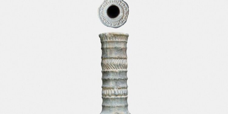 “Este recipiente, hecho de fina roca verde clorítica, replica la forma de un segmento de caña de pantano; la gente cortaba entonces las cañas en segmentos para usarlos como contenedores baratos [para] su uso diario. Pero en este caso, el recipiente está hecho de una piedra elegante y valiosa”, detalló.