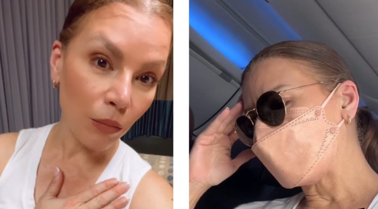 La artista de 56 años a través de su perfil de Instagram compartió el momento de angustia que vivió durante su arribó a suelo nacional, ya que el avión de manera repentina se elevó causándole una gran susto y que la dejo muy agotada, según lo expresado en el clip.