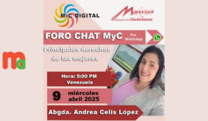 En este foro chat vamos a informar, para generar conciencia en torno a los principales derechos de las mujeres, sus mecanismos de protección, retos y avances para reducir la brecha de género. Mientras las mujeres puedan conocer y ejercer sus derechos van a inspirar la participación individual y colectiva en su defensa y promoción.