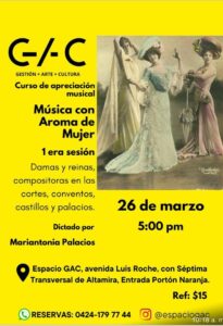 Este 26 de marzo, te invitamos a descubrir este maravilloso curso “Música con aroma de mujer”, impartido por la destacada pianista, compositora y magister en música latinoamericana, Mariantonia Palacios.