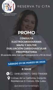 Cupos limitados. Llama y reserva tu cupo. PROMOCIONES. Consulta+Electrocardiograma 30$ Holter 20$ Mapa 20$ Ecocardiograma 30$ Evaluación Cardiovascular Preoperatoria 30$