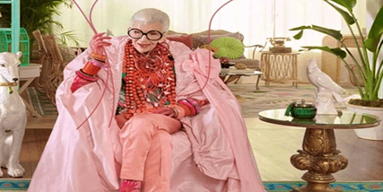 Además de su innegable talento para la decoración, Iris Apfel ha destacado por su particular estilo a la hora de vestir y sus extravagantes looks. Tanto que en el 2005, el Costume Institute del MET de Nueva York montó una exhibición en su honor; a la que nombraron, Iris Apfel: Rara Avis.