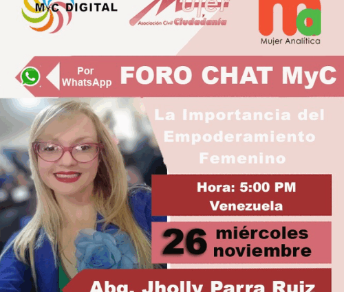 (23 noviembre 2025) Muje y Ciudadanía, a través de la Coordinación de Formación Online continúa su programación de los miércoles con el desarrollo del foro chat por la aplicación whatsapp. El miércoles 26 de noviembre, desarrollaremos el tema «La Importancia del Empoderamiento Femenino«, el cual tiene por objetivo exponer la necesitdad de la igualdad de oportunidades desde la autonomia de la mujer, lo que sin duda contribuye a construir un mundo mas equitativo, convirtiendose en pieza clave para el desarrollo y sostenibilidad de los DDHH.