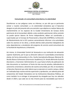 En un comunicado publicado en sus redes sociales, García Arocha recordó que las labores de recuperación que se lleven a cabo en la Ciudad Universitaria deben ser bajo la estricta supervisión y aprobación de las autoridades de la UCV.