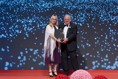 Eva Nogales recibía el Premio Shaw en Hong Kong el 12 de noviembre, de manos del astrofísico alemán Reinhard Genzel, ganador del Nobel de Física.Fundación Premio Shaw