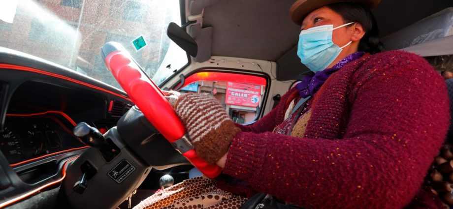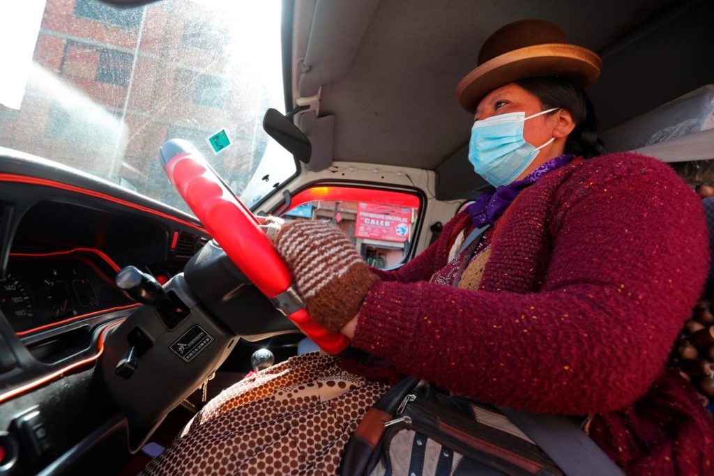 La conductora indígena Mery Yujra, componente de la Central de Mujeres Productivas y Emprendedoras, conduce un minibús el 29 de septiembre de 2021, en El Alto (Bolivia). EFE/ Martin Alipaz