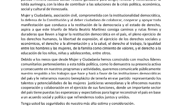 Debido a los nexos que desde Mujer y Ciudadanía hemos construido con muchos líderes comunitarios pertenecientes a esta tolda política, como lo demuestra su presencia activa y consecuente en nuestros programas y actividades, queremos comunicarle públicamente nuestro respaldo a los trabajos que hace y hará a favor de las instituciones democráticas del país y le reiteramos nuestro beneplácito de tenerla en ese partido representando los talentos y potencialidades de las mujeres justicieras venezolanas y le ofrecemos nuestra cooperación y colaboración en el ejercicio de sus funciones, donde un importante sector del país tiene puestas las esperanzas y expectativas para lograr reconstruir el país en base a un acuerdo social y político que refrendemos todos juntos y unidos.
