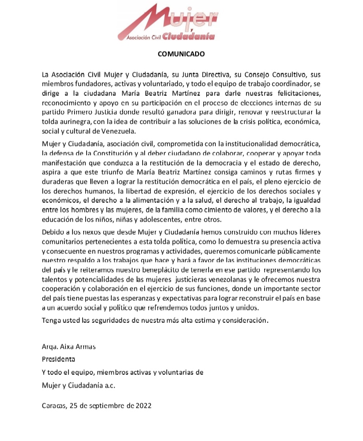 La Asociación Civil Mujer y Ciudadanía, su Junta Directiva, su Consejo Consultivo, sus miembros fundadores, activas y voluntariado, y todo el equipo de trabajo coordinador, se dirige a la ciudadana María Beatriz Martínez para darle nuestras felicitaciones, reconocimiento y apoyo en su participación en el proceso de elecciones internas de su partido Primero Justicia donde resultó ganadora para dirigir, renovar y reestructurar la tolda aurinegra, con la idea de contribuir a las soluciones de la crisis política, económica, social y cultural de Venezuela.