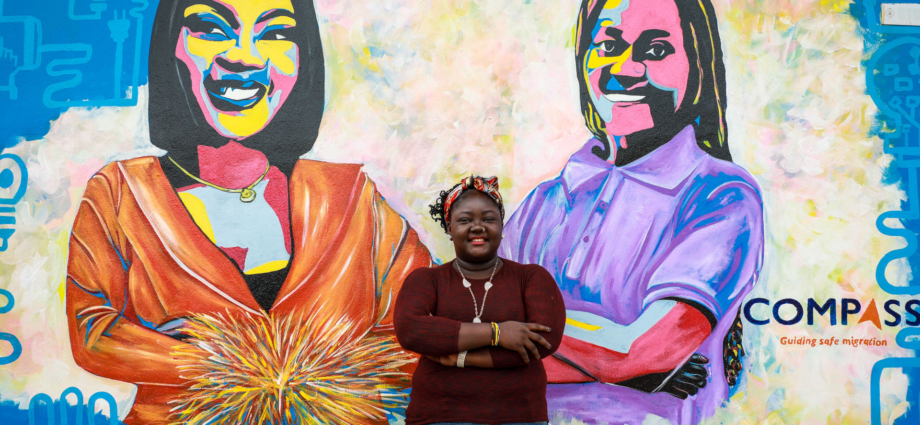 El mural de Fasilat Omolola Eletu, en su ciudad natal en Lagos, es un poderoso testimonio del potencial transformador del arte. Esta obra muestra a Rita Abu, persona retornada de Libia que encontró su camino en la tecnología con la asistencia de la Organización Internacional para las Migraciones (OIM) y que ha sido un faro de esperanza para las personas migrantes y también para las jóvenes. A su lado está de pie Adaora Nwodo, ingeniera de software que ha ganado varios premios por haber sido pionera en tecnología de realidad mixta.