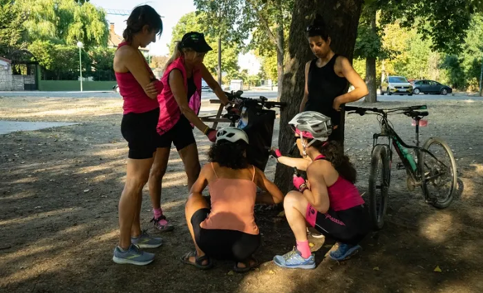Por su parte Cristina llegó a la asociación cansada de estar en grupos de bicicleta mixtos en los que cuando tenía algún problema mecánico no paraba de escuchar como los hombres le decían “ya lo arreglo yo”. Gracias a sus conocimientos y experiencia moviéndose en bici, ahora explica al resto de compañeras cómo arreglar pinchazos, cambiar la cámara, engrasar cadena o ajustar un freno cuando se necesita.