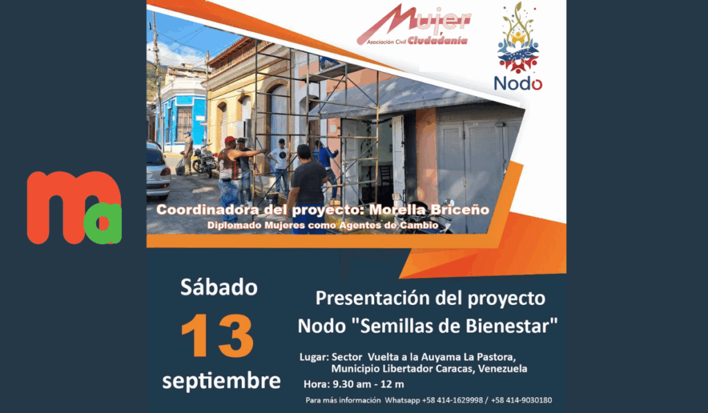 (29 agosto 2025) Mujer y Ciudanía y el proyecto Nodo “ Semillas de Bienestar” los invitan el sábado 13 de septiembre de 9.30 am a 12 m a la presentación de dicho proyecto realizado por Morella Briceño, graduanda del diplomado Mujeres como Agentes de cambio, en el sector Vuelta a la Auyama parroquia La Pastora – Caracas