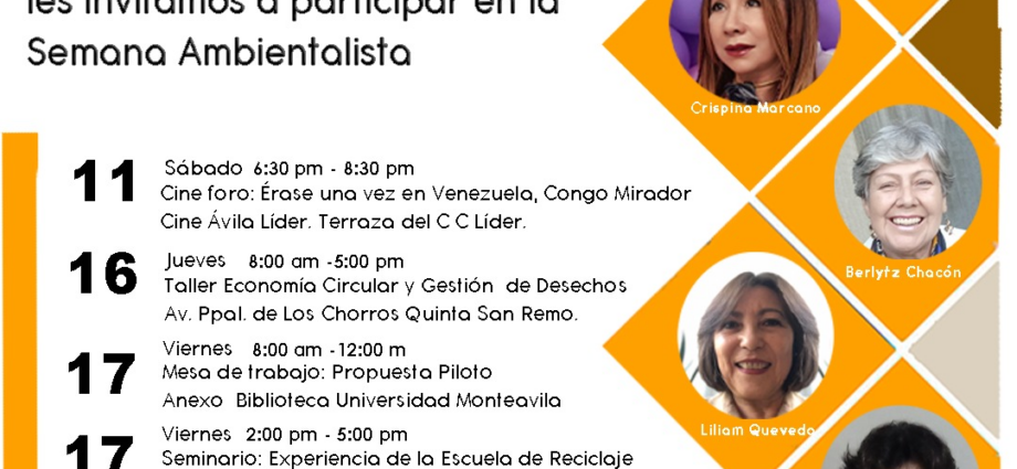 (Especial: Mayo 2024) La Asociación Civil Mujer y Ciudadanía y la Universidad Monteavila junto a las organizaciones Escuela de Reciclaje de San Cristóbal estado Táchira, Funvive, Gran Cine, Caracas Verde, NEO, Movimiento de la Arquitectura del Futuro, Alternos, Multirecycla, Recyclers, Naturarte, Zona de Descarga, Cayapa a la Basura, se complacen en invitarles a celebrar el Día Mundial del Reciclaje, con un conjunto de actividades que se realizarán los días 11, 16 y 17 de mayo del 2024.