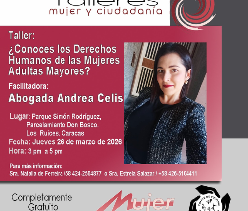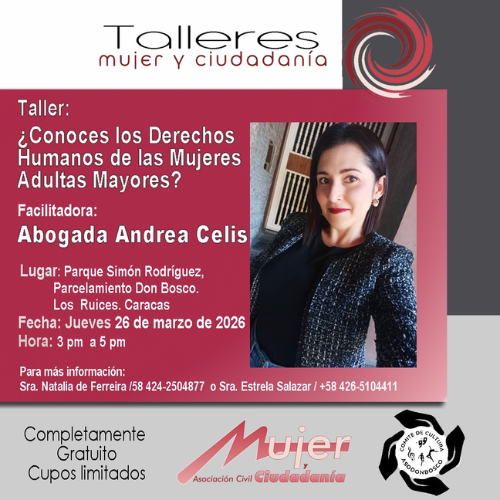 (23 marzo 2026) La asociación civil MujeryCiudadanía, en alianza con el Comité de Cultura de Asodonbosco, continúa celebrando el Mes de la Mujer, en este sentido promueve el taller gratuito: ¿Conoces los Derechos Humanos de las Mujeres Adultas Mayores?, el cual se desarrollará el jueves 26 de marzo de 2026 de 3:00 pm a 5:00 pm en el Parque Simón Rodríguez, Parcelamiento Don Bosco, Los Ruices. Caracas.