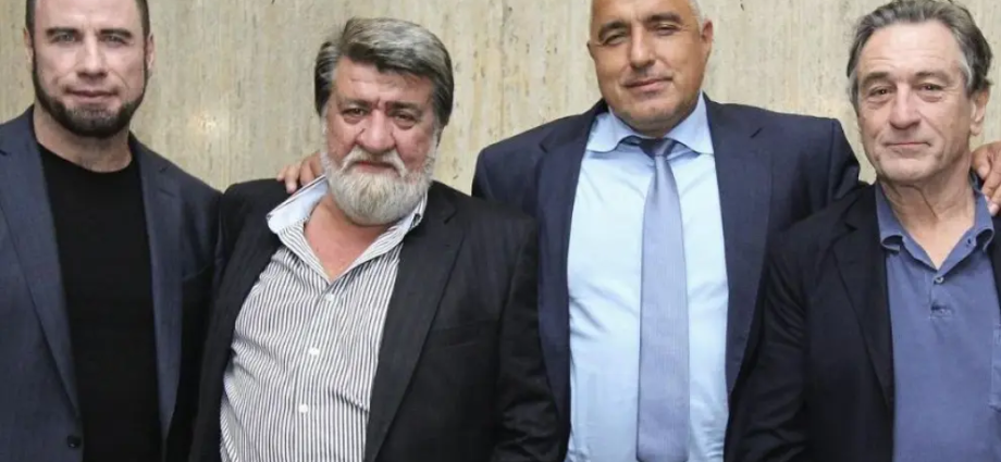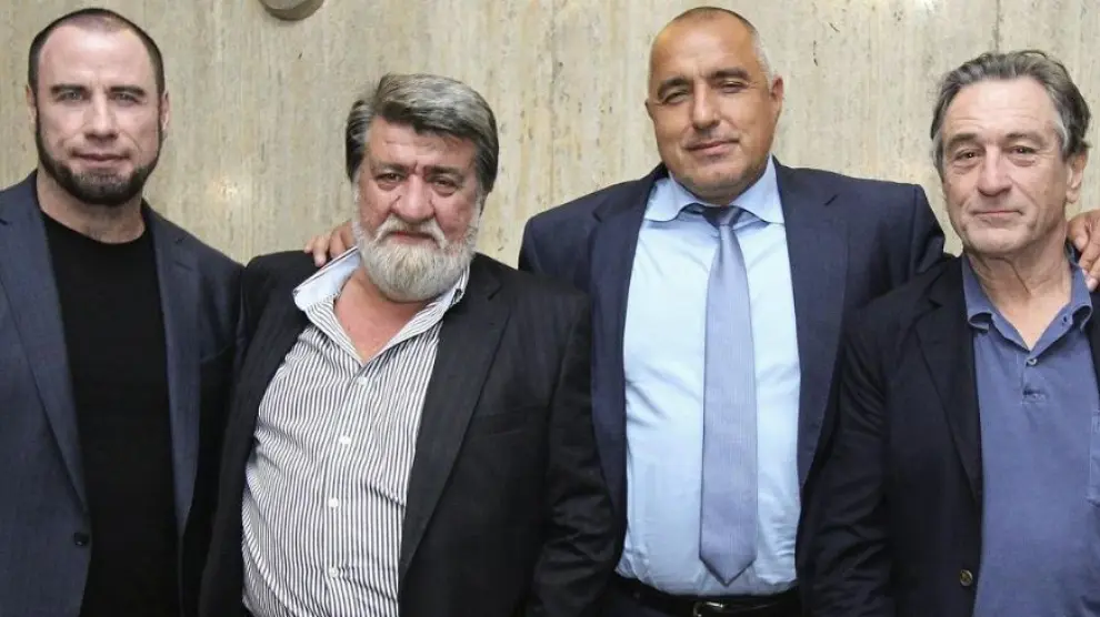 El diputado Vezhdi Rashidov (2i) en octubre de 2012, cuando era ministro de cultura posando junto al actor estadounidense John Travolta (i), el entonces primer ministro búlgaro Boyko Borisov (2d), y el actor estadounidense Robert DeNiro (d).