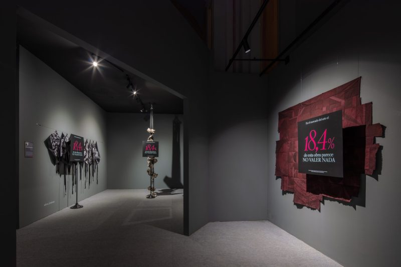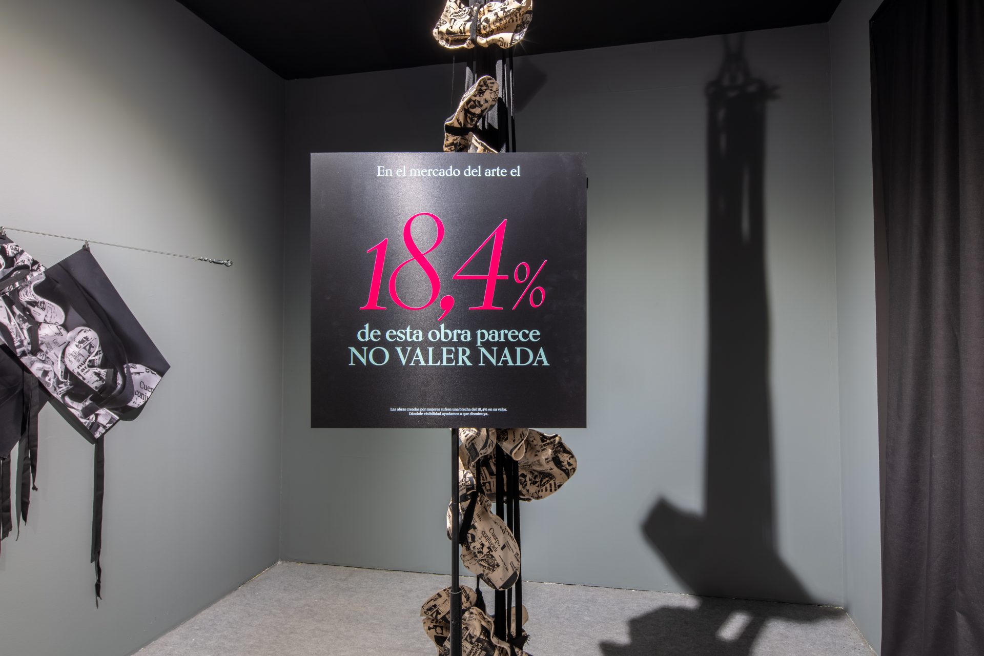 Los espectadores de la muestra “La Iberoamericana de Alcalá, mujer y artes visuales en el siglo XXI” se han sorprendido al descubrir que una selección de las pinturas, esculturas e instalaciones de la misma están intencionalmente cubiertas con un parche visual que ocupa el 18,4% de las obras, un porcentaje que refleja de manera exacta la diferencia entre lo que se paga a un artista si es mujer o si es hombre. En la parte cubierta, se puede leer el mensaje “En el mercado del arte, el 18,4% de esta obra parece no valer nada”.