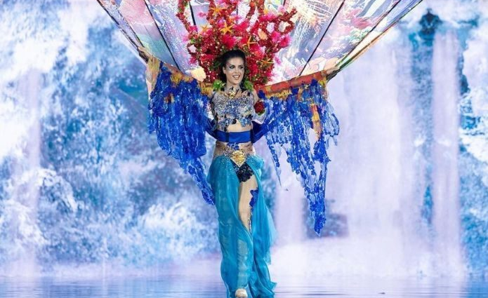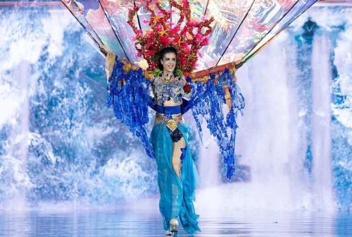 Además de su increíble pasarela de presentación y pasarela en traje de baño, Valentina se llevó ovaciones y aplausos durante su desfile de traje típico, un espectacular traje decorado con los colores de la bandera tricolor, flores y corales adornando la capa, además de una corona de coral y una imponente lanza. El traje fue llamado “La Protectora de Mochima”, el cual estaba inspirado en el Parque Nacional Mochima en el Estado Anzoategui.