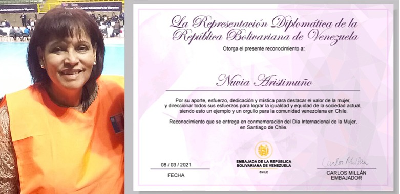Especial.- El 8 de marzo, en honor al Día Internacional de La Mujer y la gran labor que cumplen en el área laboral, la Representación Diplomática de la República Bolivariana de Venezuela, hizo entrega de un reconocimiento a Nuvia Aristimuño, por su aporte, entrega y gran labor con las mujeres como ejemplo de la comunidad venezolana en Chile.