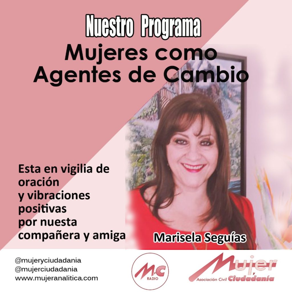 Nuestra compañera Marisela Seguías, egresada de la IV Cohorte del Diplomado Mujeres como Agentes de Cambio, coproductora y conductora de nuestro programa de radio Mujeres como Agentes de Cambio, miembro activa de Mujer y Ciudadanía se encuentra hospitalizada en cuidados intensivos por Covid 19.